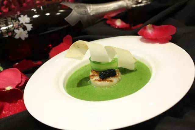 Grilled Scallop and caviar wit"Ω h asparagus soup